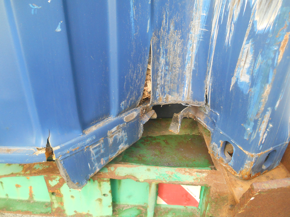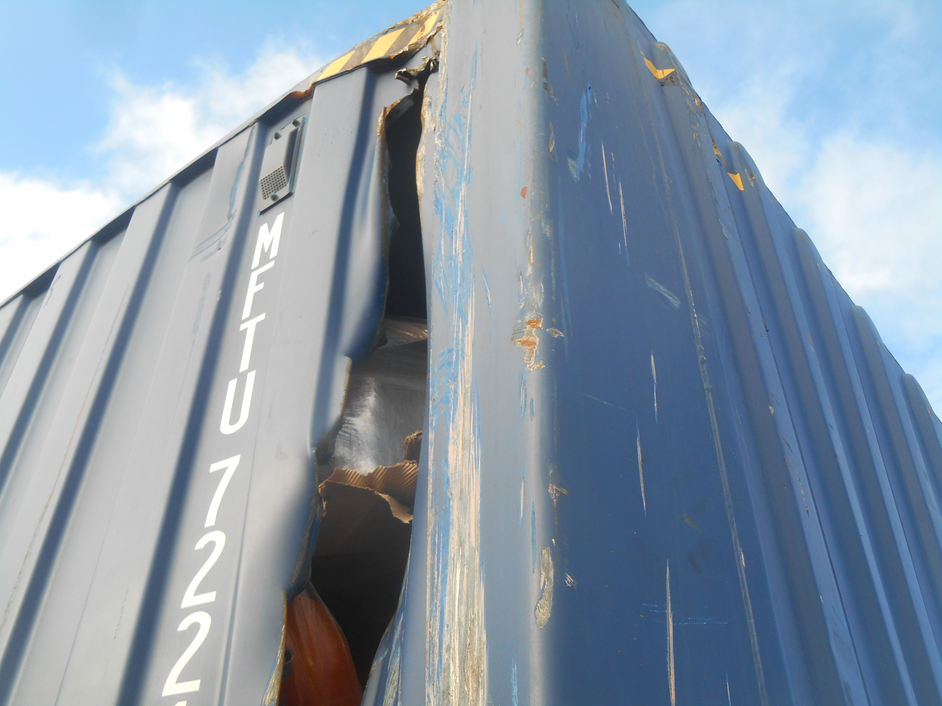 Le conteneur présente des avaries susceptibles d’avoir compromis son étanchéité et/ou la sécurité de son contenu. Une expertise complémentaire du chargement est recommandée.