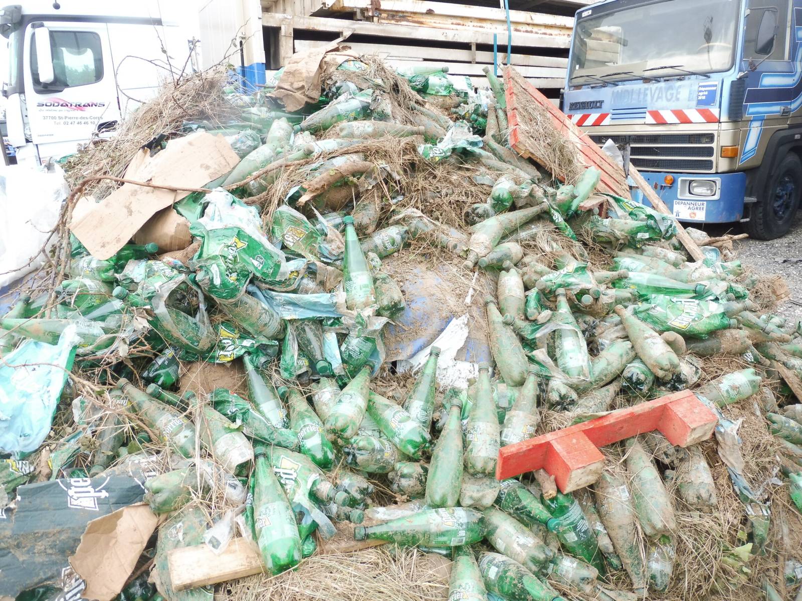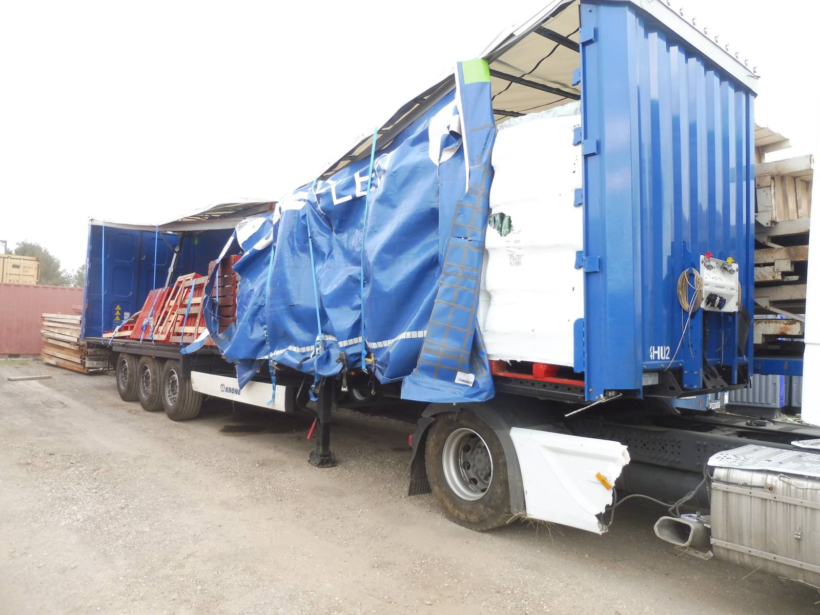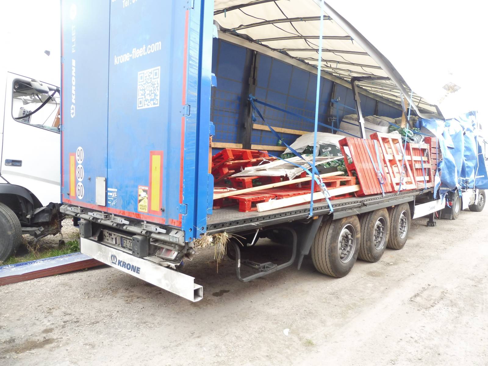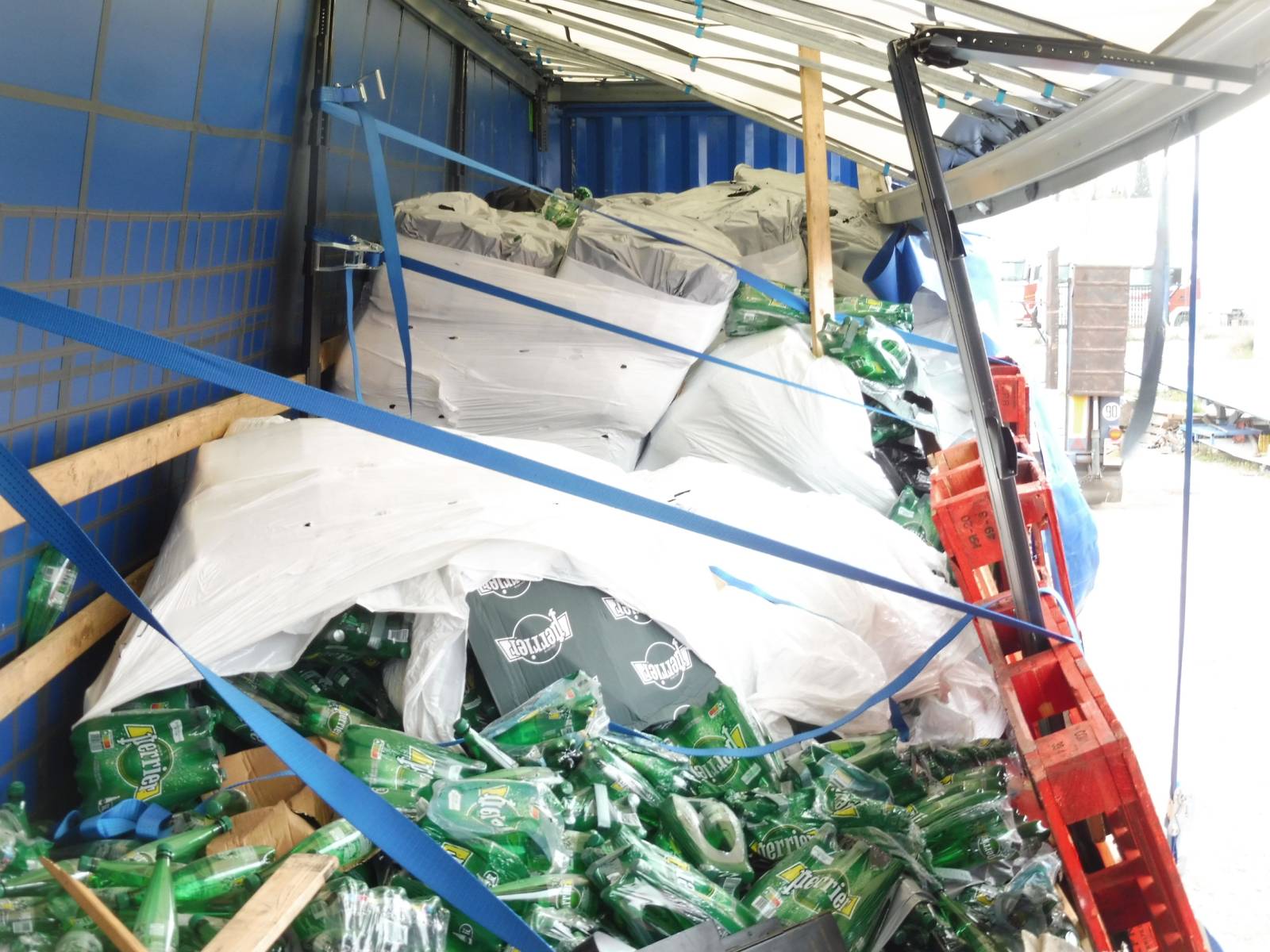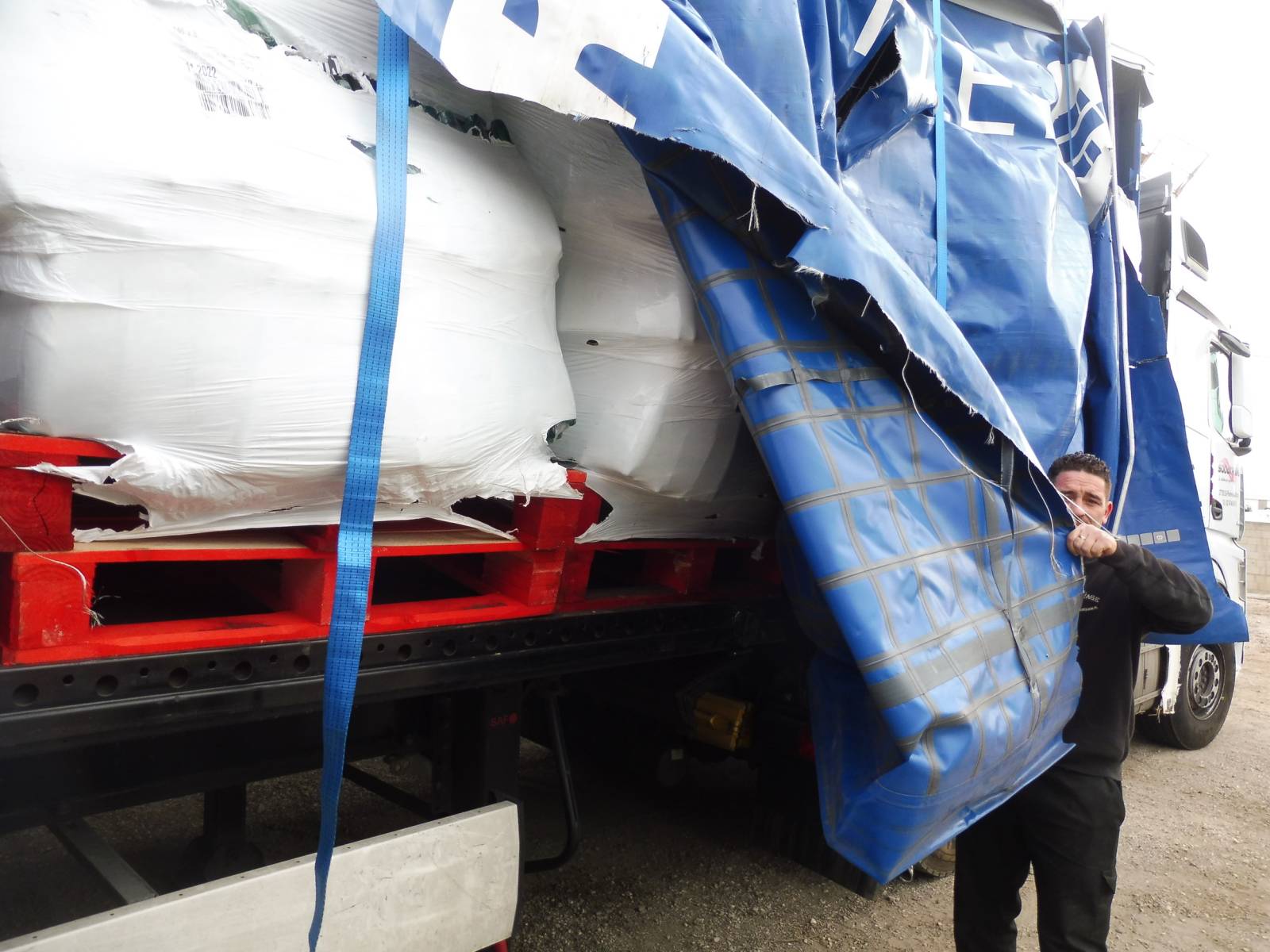 À l’arrivée sur site, nos équipes ont constaté qu’environ 14 palettes étaient totalement désintégrées hors du véhicule, tandis que 11,5 palettes restaient à l’intérieur, dans un état visiblement récupérable malgré un certain désordre.