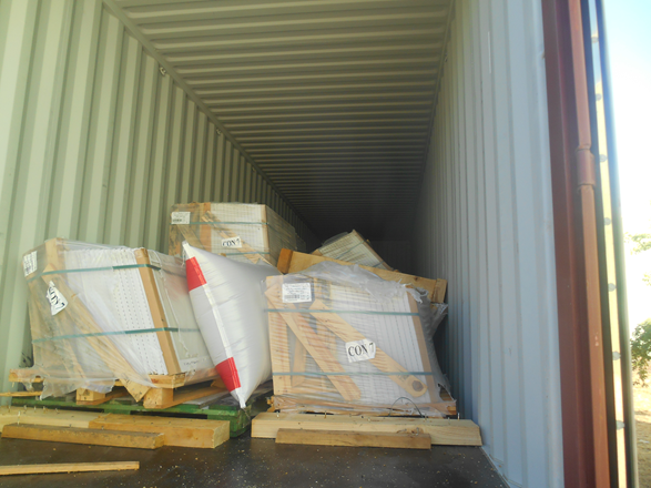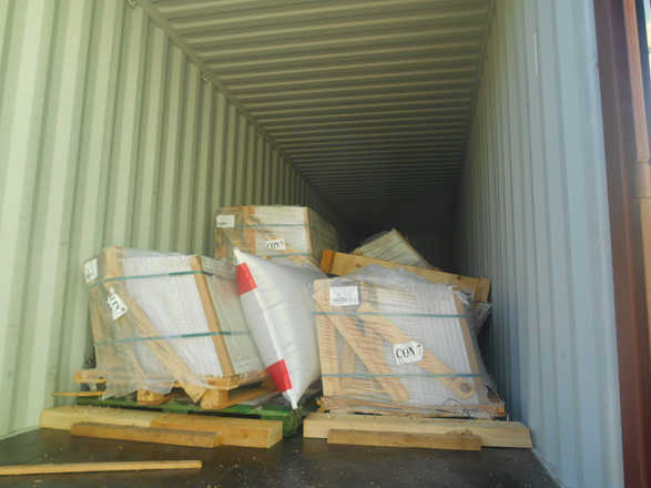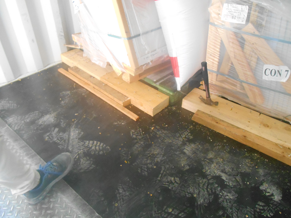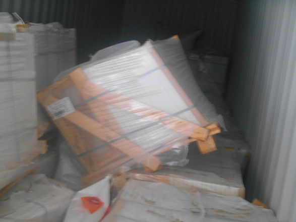 Lors de l’ouverture, il a été constaté que le calage était insuffisant, malgré l’utilisation de dunnages et de tasseaux en bois. De nombreuses palettes étaient empilées sans séparation et beaucoup étaient inclinées, avec feuillards et cerclages cassés et certains air bags dégonflés.